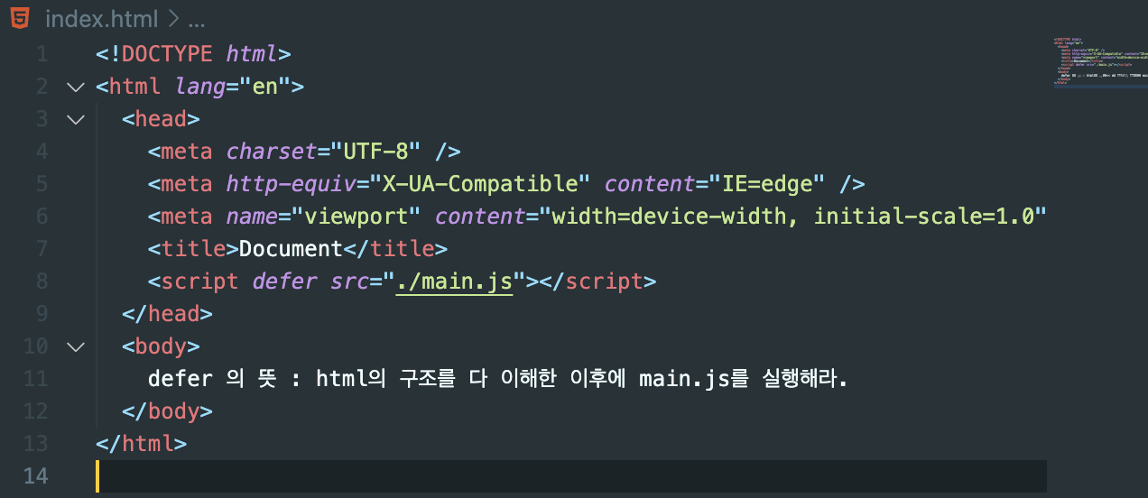 <script defer src="./main.js"></script>*문서는 위에서 아래 순으로 읽게 되는데